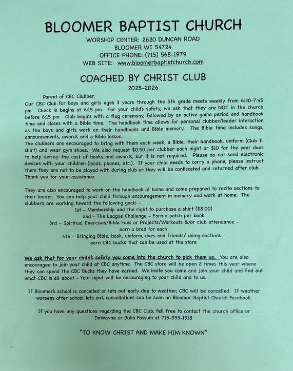 Coached By Christ is our children's Bible club for ages 3 years old through 5th grade. We meet for games, handbooks, songs, a Bible lesson, and other fun activities throughout the school year on Wednesday nights from 6:30-7:45 p.m.